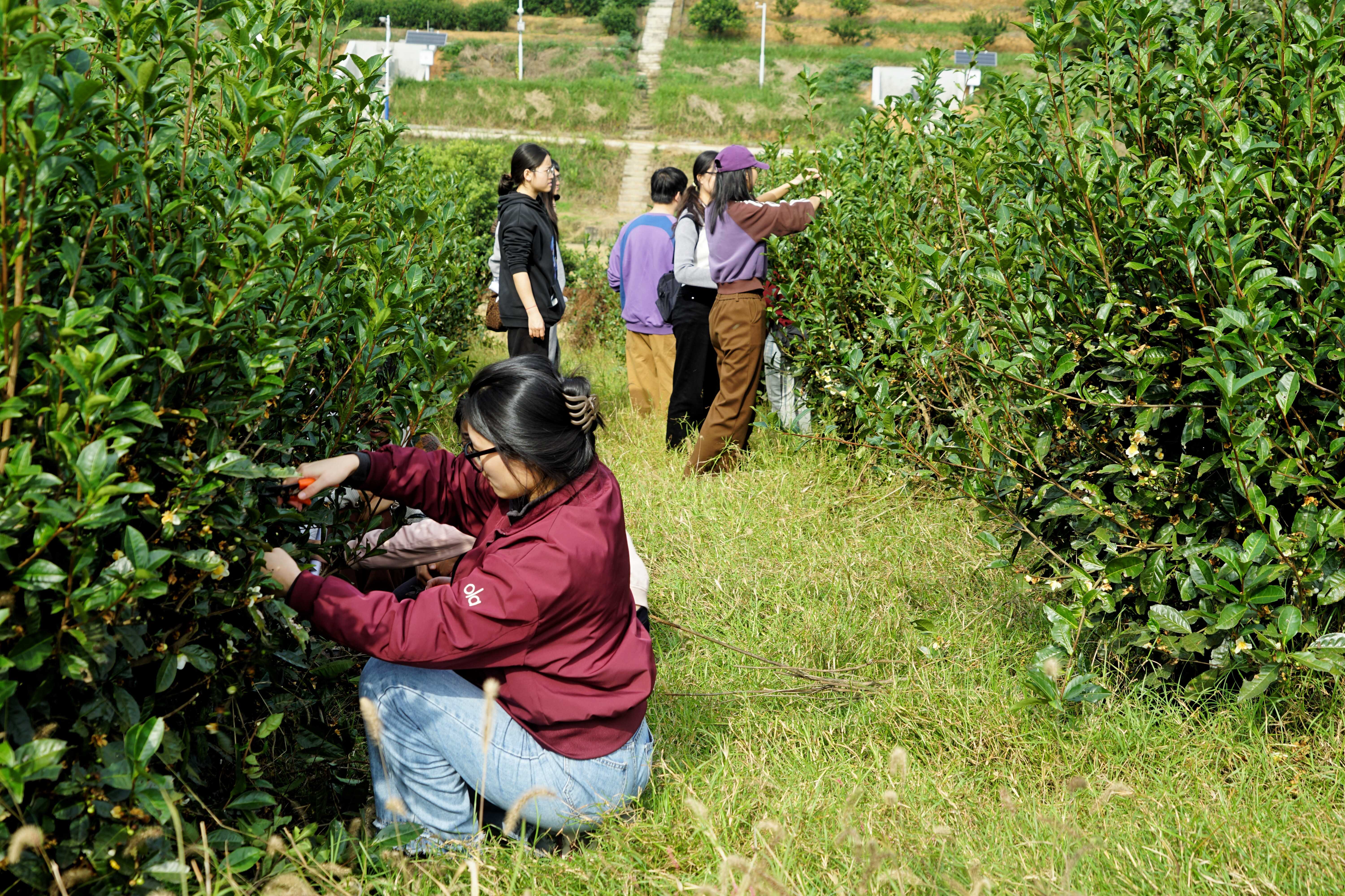 在劳动实践环节,台站技术人员系统讲解了茶树修剪技术要点与科学施肥方法标准。支部党员们在专家指导下实操,亲手完成茶树修剪,掌握了实用农业技能,也深刻体会到农业科研工作者扎根田野、默默奉献的精神。