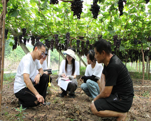 随后,博士团还来到金景丰葡萄园、韶河生态葡萄园、兴农生态果园,解答当地农户疑惑,为他们提供技术指导。针对农户提出的“为什么其他园区的葡萄已快要成熟,而他们这里的果实还未成熟,是否会错过上市期?”等问题展开了实地调研。同学们发现由于摘心时间过晚,葡萄园果实成熟较慢,同时部分叶片出现“缺素症状”。为了帮助农户理解缺素问题,带队老师徐丰摘下一片树叶并耐心解释:“叶子出现这样的斑驳时,往往是由于缺乏钾和镁造成的,后期可以在施肥的过程中添加这些元素。”同时,博士团根据葡萄园的基础设施情况,提出将大棚两端换成“防鸟网”的建议,可以有效促进棚内通风。