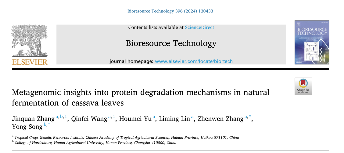 2月9日,我校bevictor伟德官网2021级农艺与种业(园艺)硕士研究生张金泉以第1作者(共1,排第1)在Bioresource Technology杂志(中科院1区,IF 11.4)在线发表题为“Metagenomic insights into protein degradation mechanisms in natural fermentation of cassava leaves”的研究论文,该研究在木薯叶自然发酵蛋白质降解机制研究方面取得重要进展,揭示了木薯叶自然发酵过程中微生物降解蛋白质的机制,研究结果为拓展木薯叶资源的高效利用和开发功能食品奠定了重要的理论基础。
