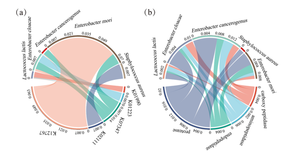 发酵木薯叶蛋白质降解相关菌种与其主要功能基因(a)和蛋白酶基因(b)相关性图