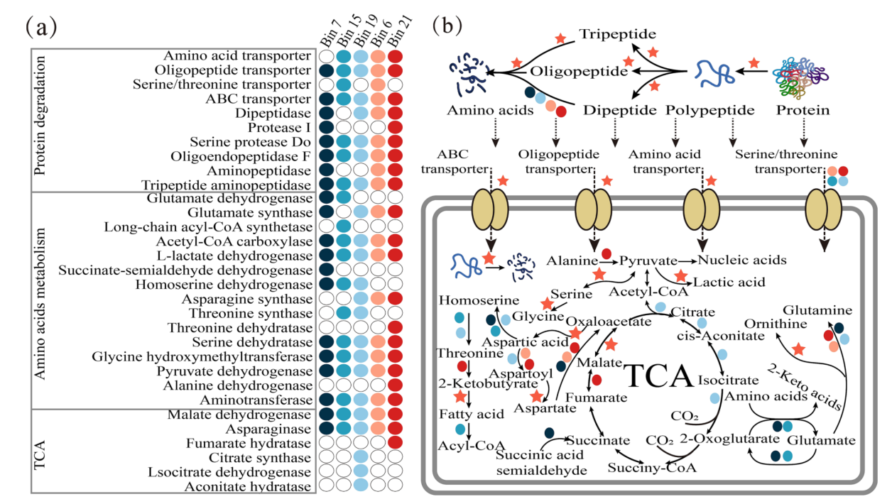 该研究着眼于木薯叶在自然发酵过程中微生物群落的功能基因组成和蛋白质降解机制,通过对非冗余基因的蛋白序列进行KEGG和eggNOG功能数据库的分析,发现在木薯叶发酵过程中,微生物群落的代谢活动主要集中在氨基酸代谢方面,而能量代谢则呈现下降趋势;木薯叶结构蛋白显著转化为富含必需氨基酸的可消化肽;以假单胞菌、肠杆菌、埃希氏菌和克雷伯氏菌等优势菌为主导的微生物活性影响着粗多肽和游离氨基酸浓度;Pearson相关性和宏基因组组装基因组(metagenome-assembled genomes, MAGs)分析表明,肠杆菌和乳球菌中丰富的蛋白酶和相关功能基因是木薯叶蛋白质降解的主要原因。这些发现证实了木薯叶在提高营养价值、增强风味和开发功能食品方面具有很大的潜力。