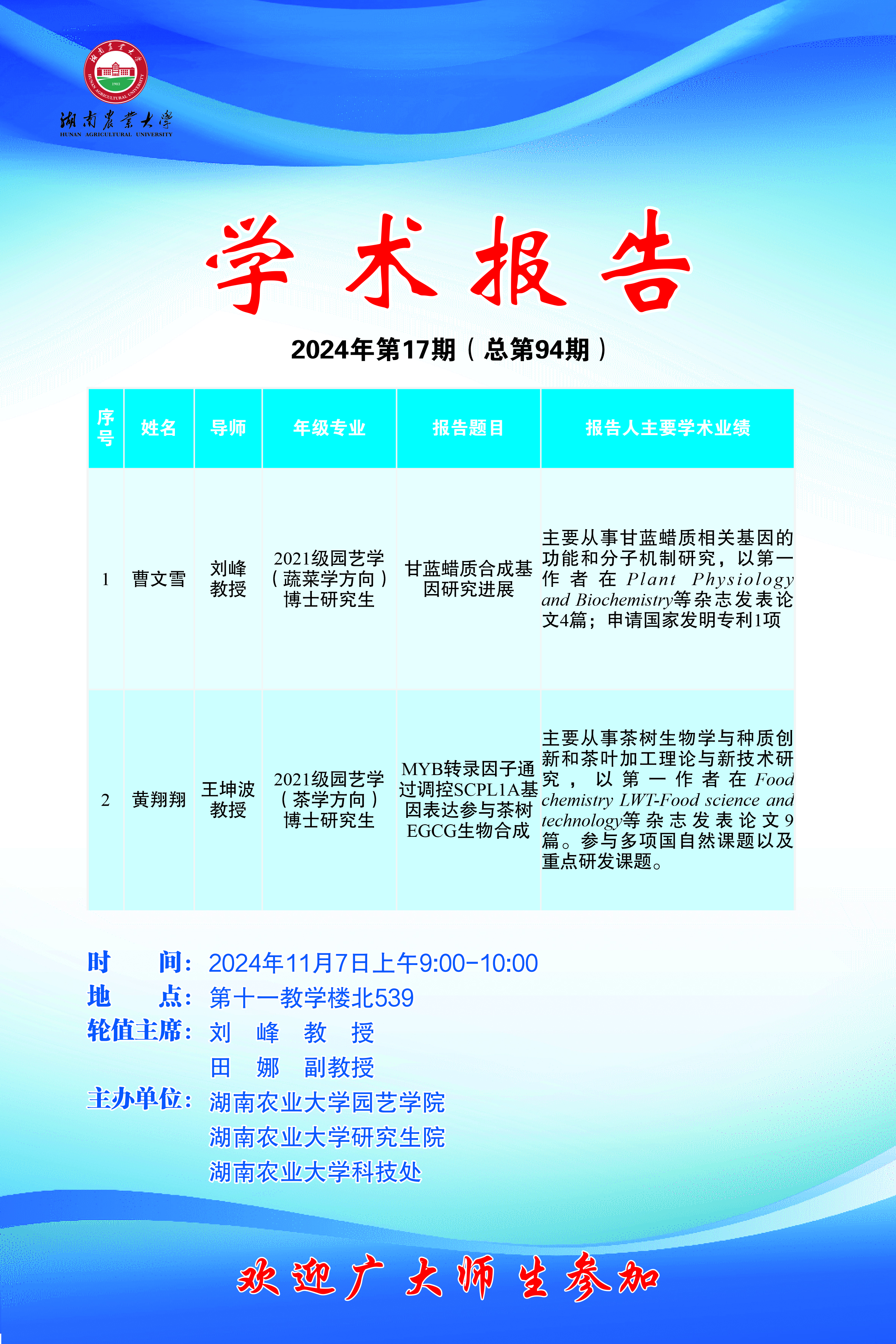 bevictor伟德官网第九十四期-博学讲坛:甘蓝蜡质合成基因研究进展;MYB转录因子通过调控SCPL1A基因表达参与茶树EGCG生物合成
