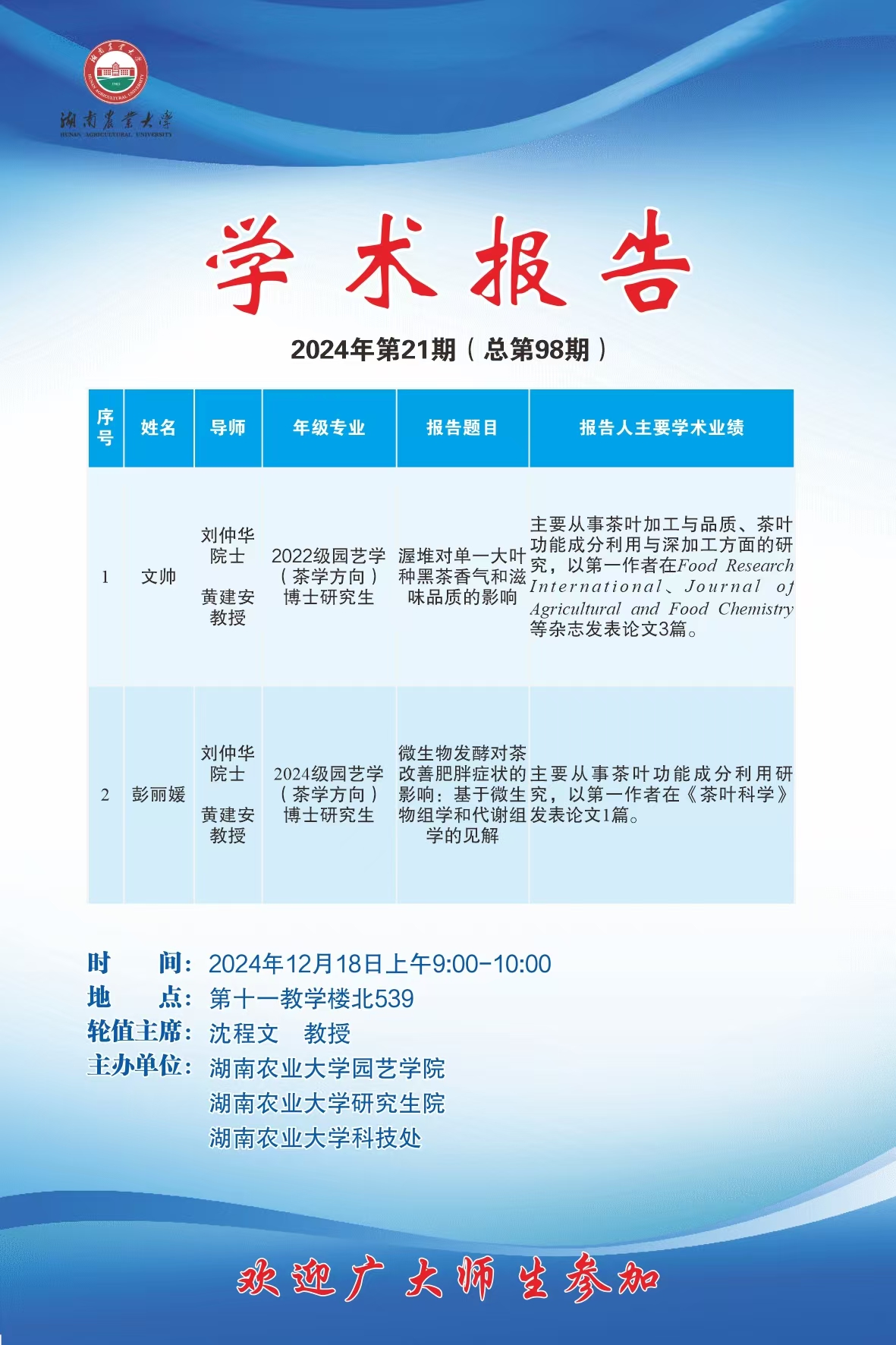 bevictor伟德官网第九十八期-博学讲坛:渥堆对单一大叶种黑茶香气和滋味品质的影响;微生物发酵对茶改善肥胖症状的影响:基于微生物组学和代谢组学的见解