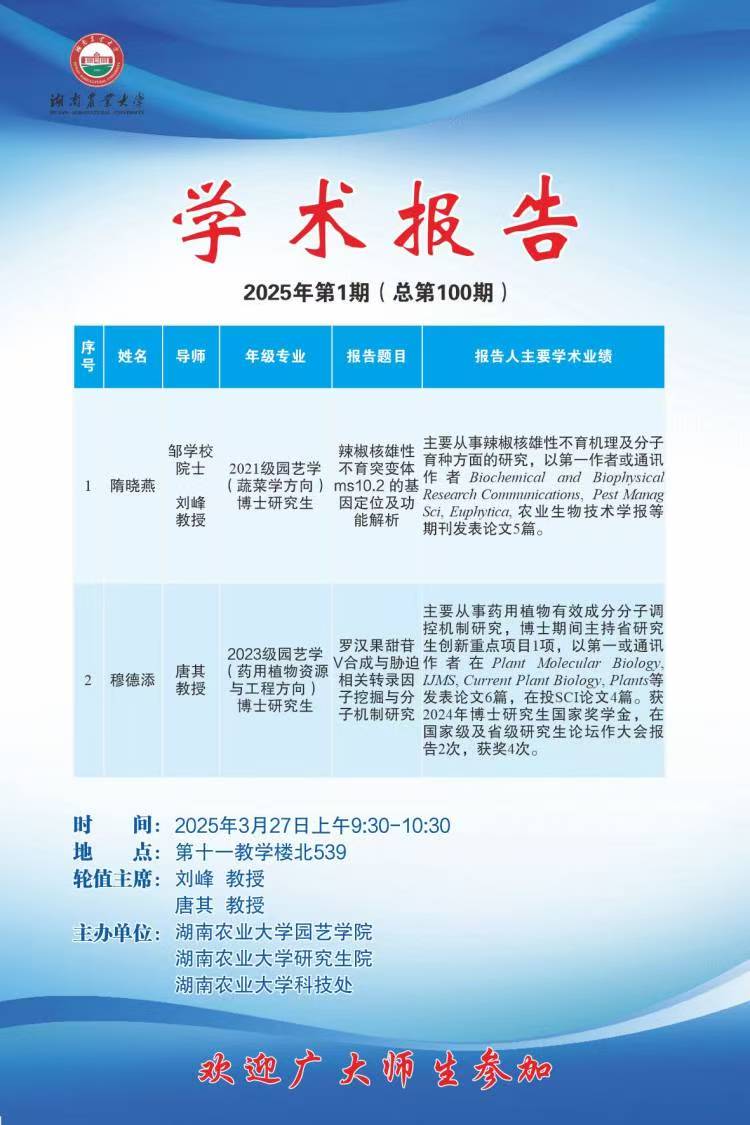 bevictor伟德官网第100期-博学讲坛:辣椒核雄性不育突变体ms10.2的基因定位及功能解析;罗汉果甜苷Ⅴ合成与胁迫相关转录因子挖掘与分子机制研究