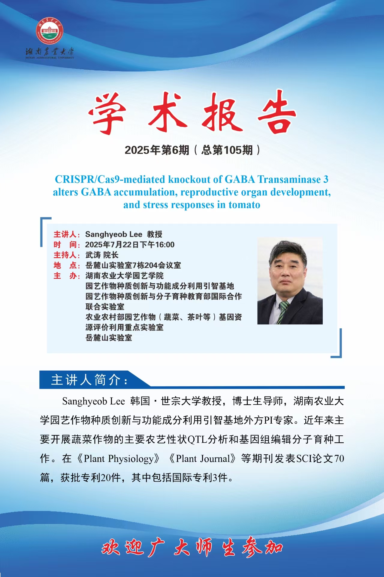 bevictor伟德官网第105期-名师讲坛:CRISPR/Cas9-mediated knockout of GABA Transaminase 3alters GABA accumulation, reproductive organ development,and stress responses in tomato
