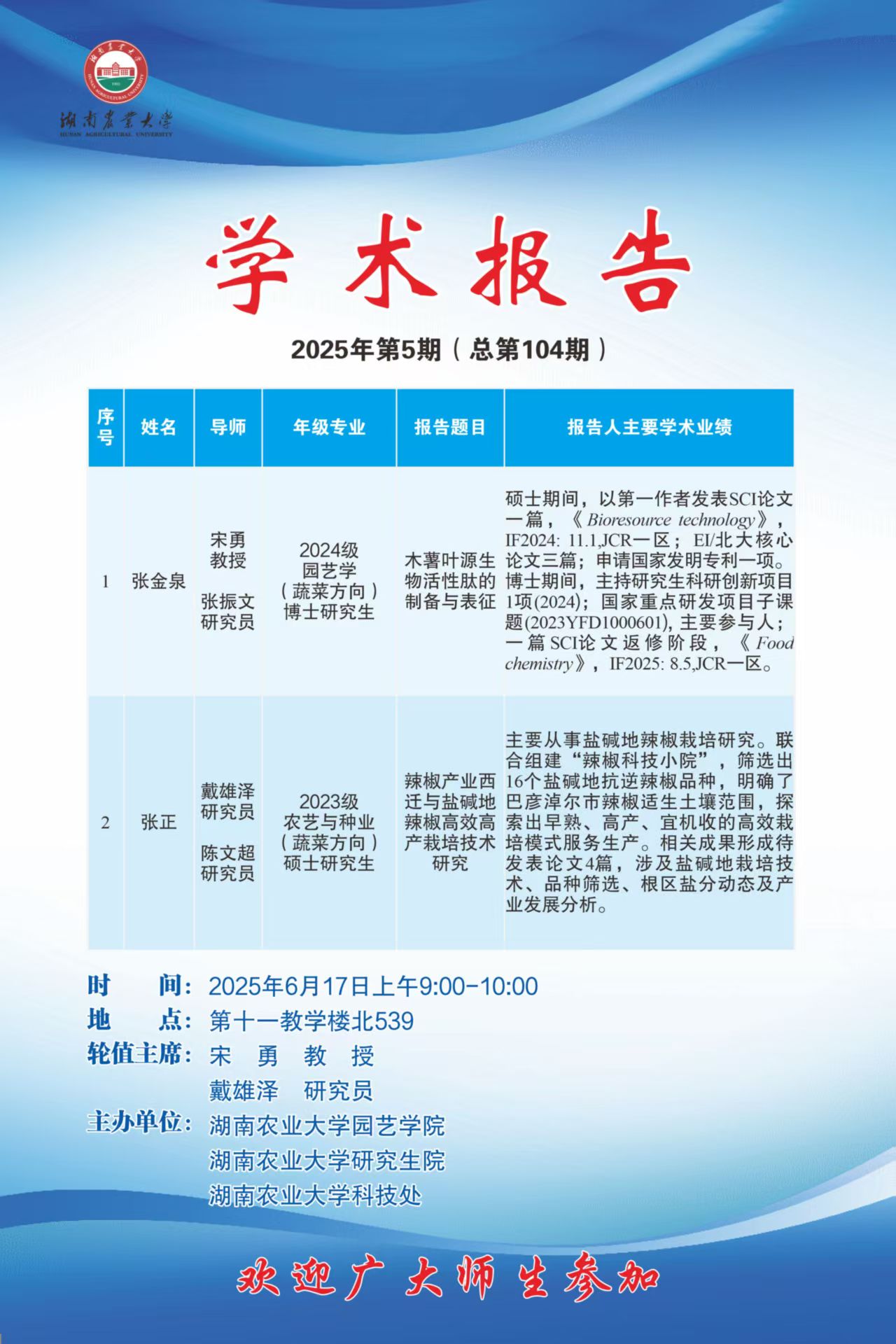 bevictor伟德官网第104期-博学讲坛:木薯叶源生物活性肽的制备与表征 辣椒产业西迁与盐碱地辣椒高效生产栽培技术研究