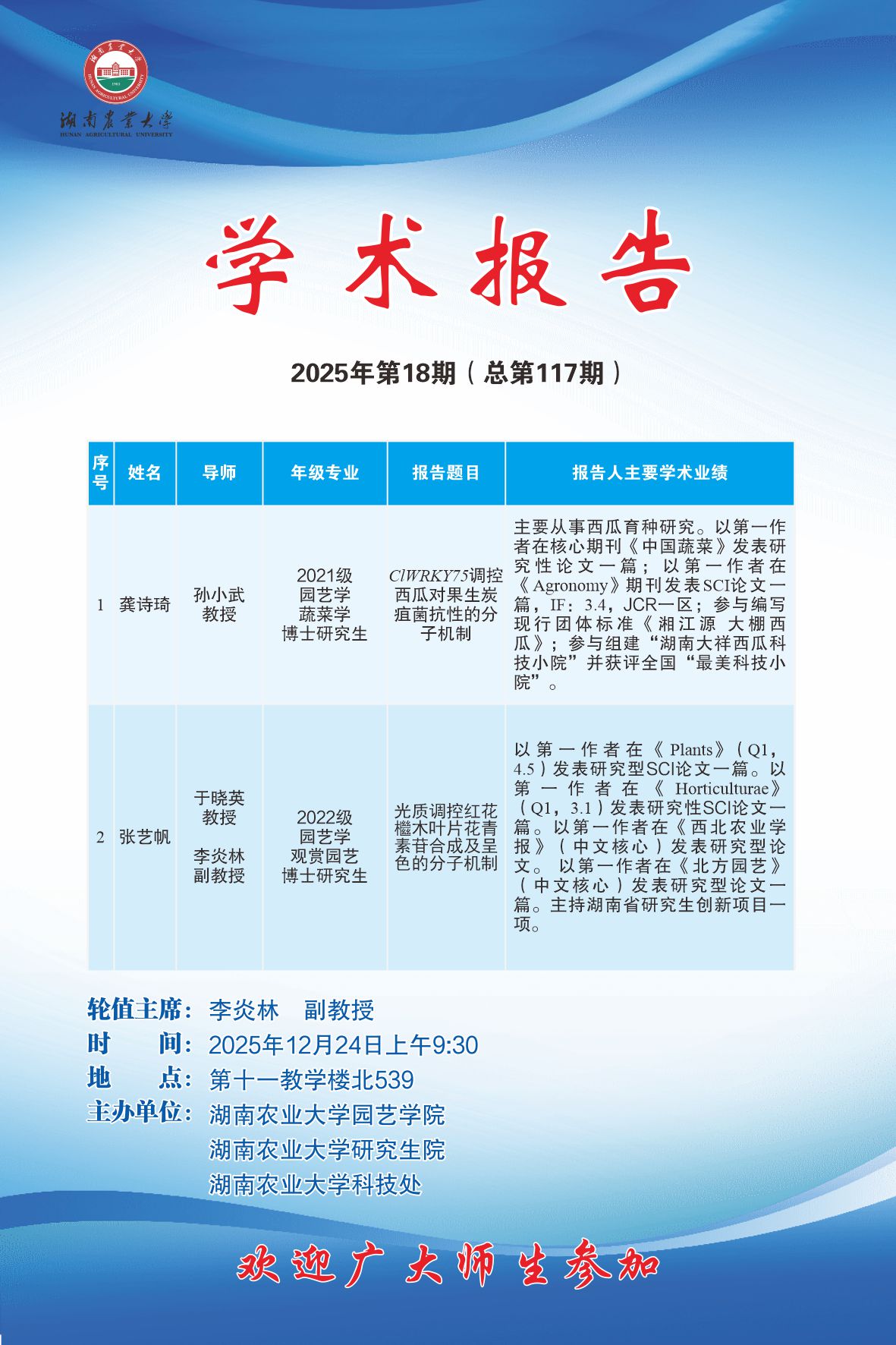 bevictor伟德官网第117期-博学讲坛:ClWRKY75调控西瓜对果生炭疽菌抗性的分子机制 光质调控红花檵木叶片花青素苷合成及呈色的分子机制