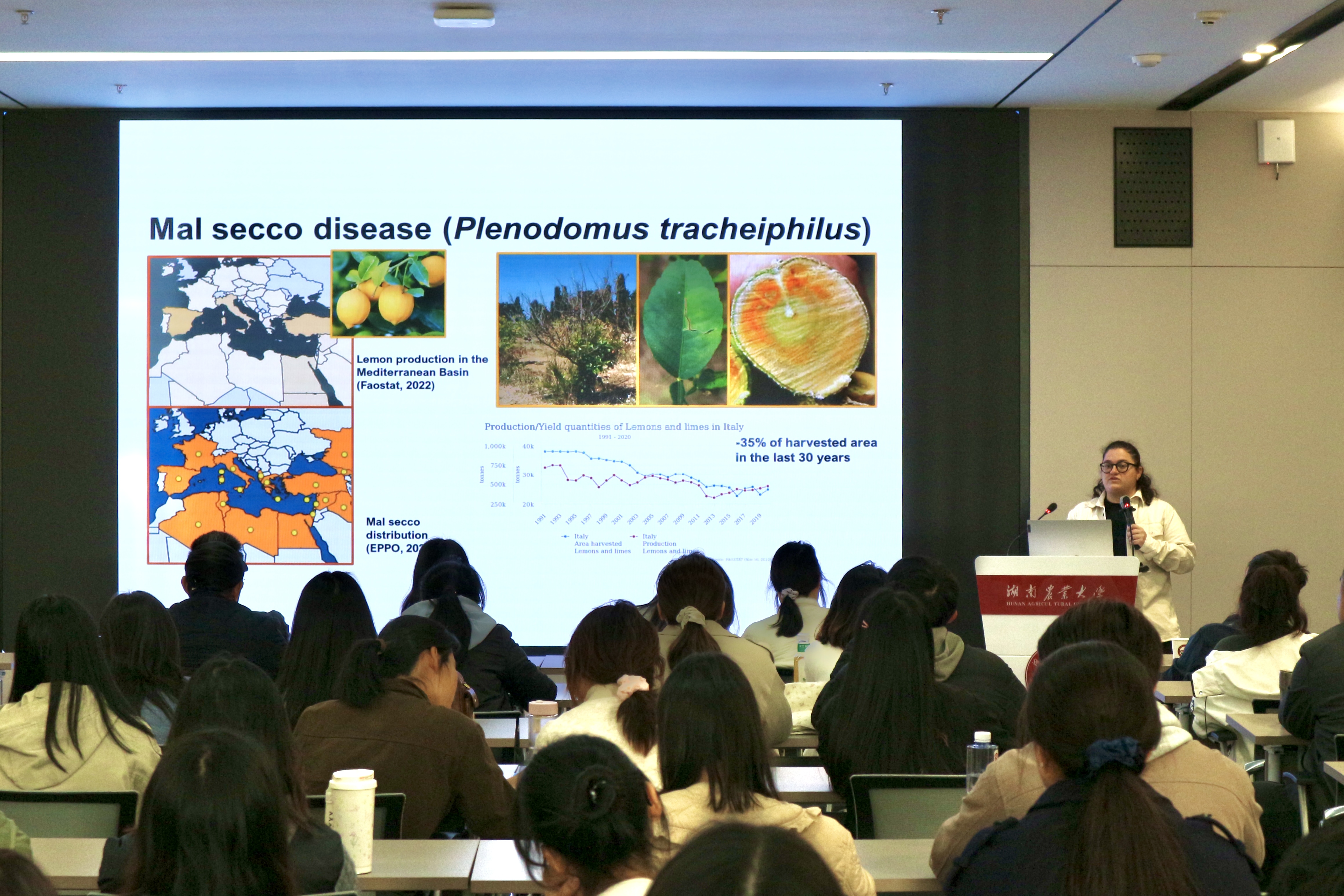 Chiara Catalano 助理教授以《Identification of resistance genes to biotic stress in Citrus》(柑橘生物胁迫抗性基因的鉴定)为题,分享了团队针对柠檬的抗逆研究。她通过明确柠檬杂交亲缘、鉴定流胶病抗性群体、构建高密度遗传连锁图谱,成功定位抗病基因区间,为柑橘抗病分子育种筑牢基础,后续还将拓展其他性状研究。