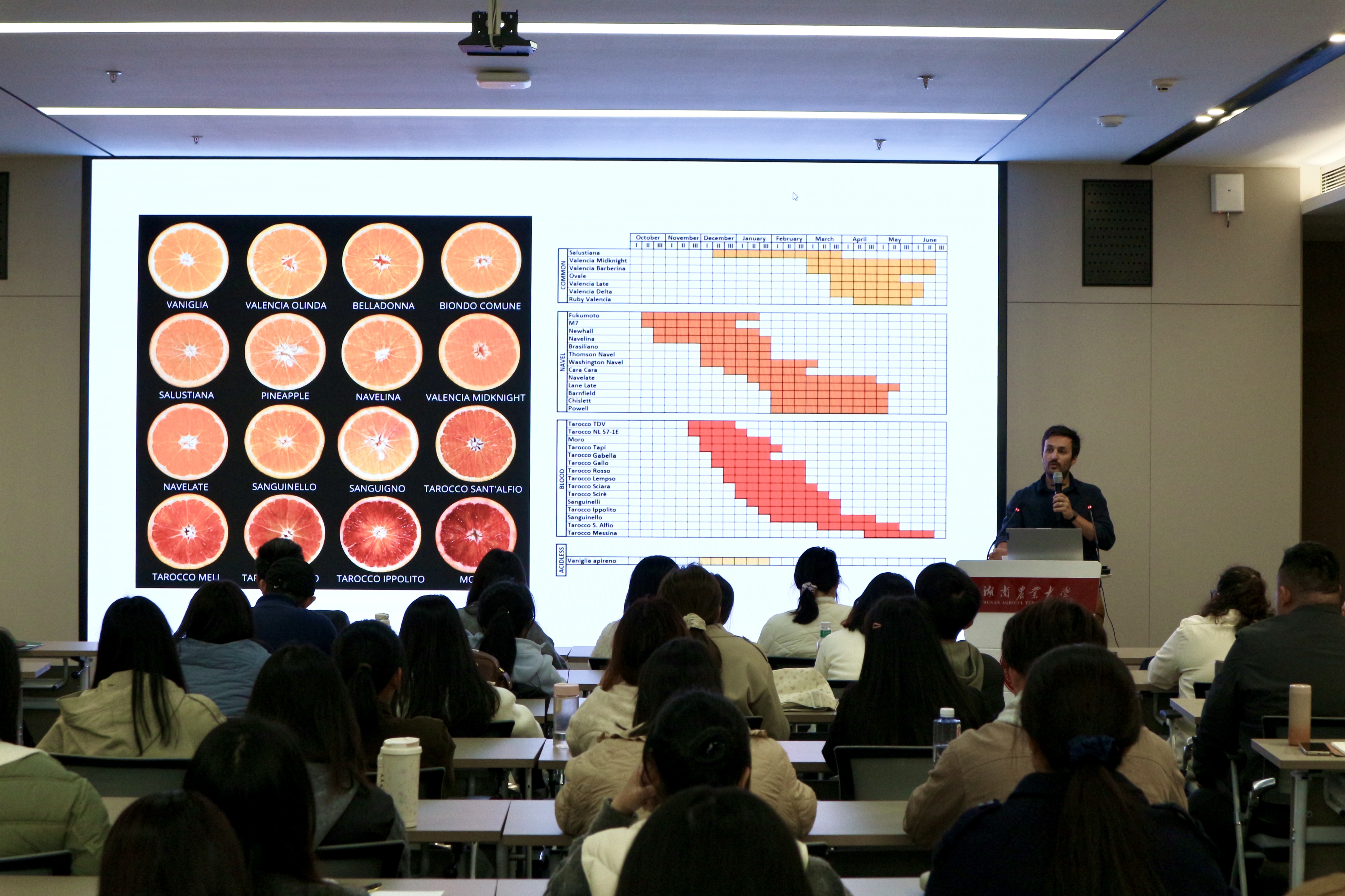 Mario Di Guardo 副教授以《Whole genome sequencing strategies for developing the sweet orange pangenome and identifying molecular markers for breeding and traceability》(构建甜橙泛基因组和鉴定育种与溯源分子标记的全基因组测序策略)为题,介绍了团队的甜橙泛基因组研究成果。团队整合多份基因组数据完成泛基因组构建,开发果汁 DNA 提取与 HRM 技术并筛选出多水平 SNP 标记,既为甜橙育种提供支撑,也可用于果品溯源与行业监管,后续将推进 GWAS 分析与基因验证。