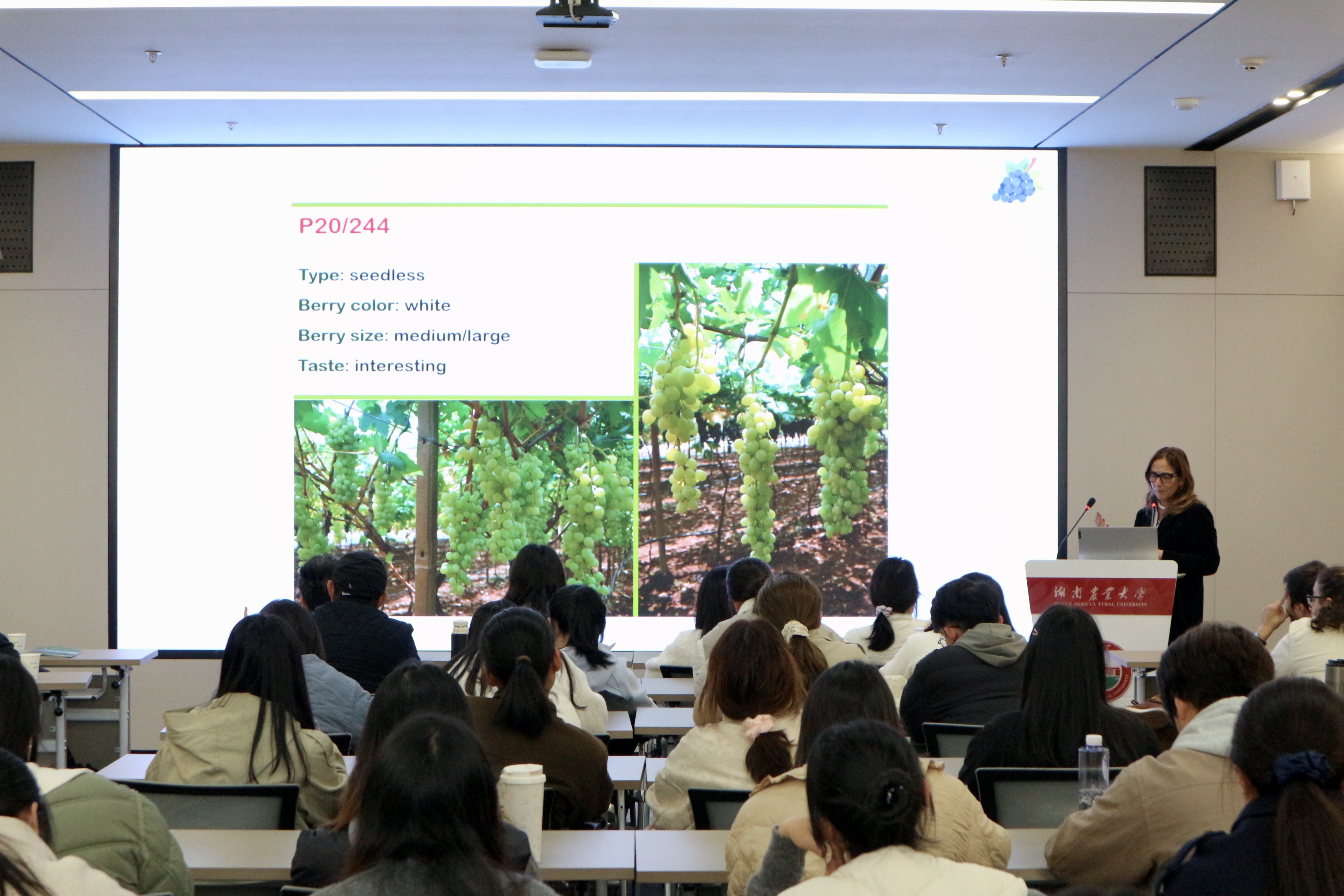 Alessandra Gentile 教授以《Grape breeding for seedlessness and disease resistance in Catania》(意大利卡塔尼亚大学葡萄无核抗病育种进展)为题,分享了当地葡萄育种实践。团队结合地域气候与市场需求,整合传统杂交和离体再生技术,辅以分子标记辅助育种,培育出多个无核葡萄品种,实现部分品种离体再生,有效助力当地葡萄产业升级。