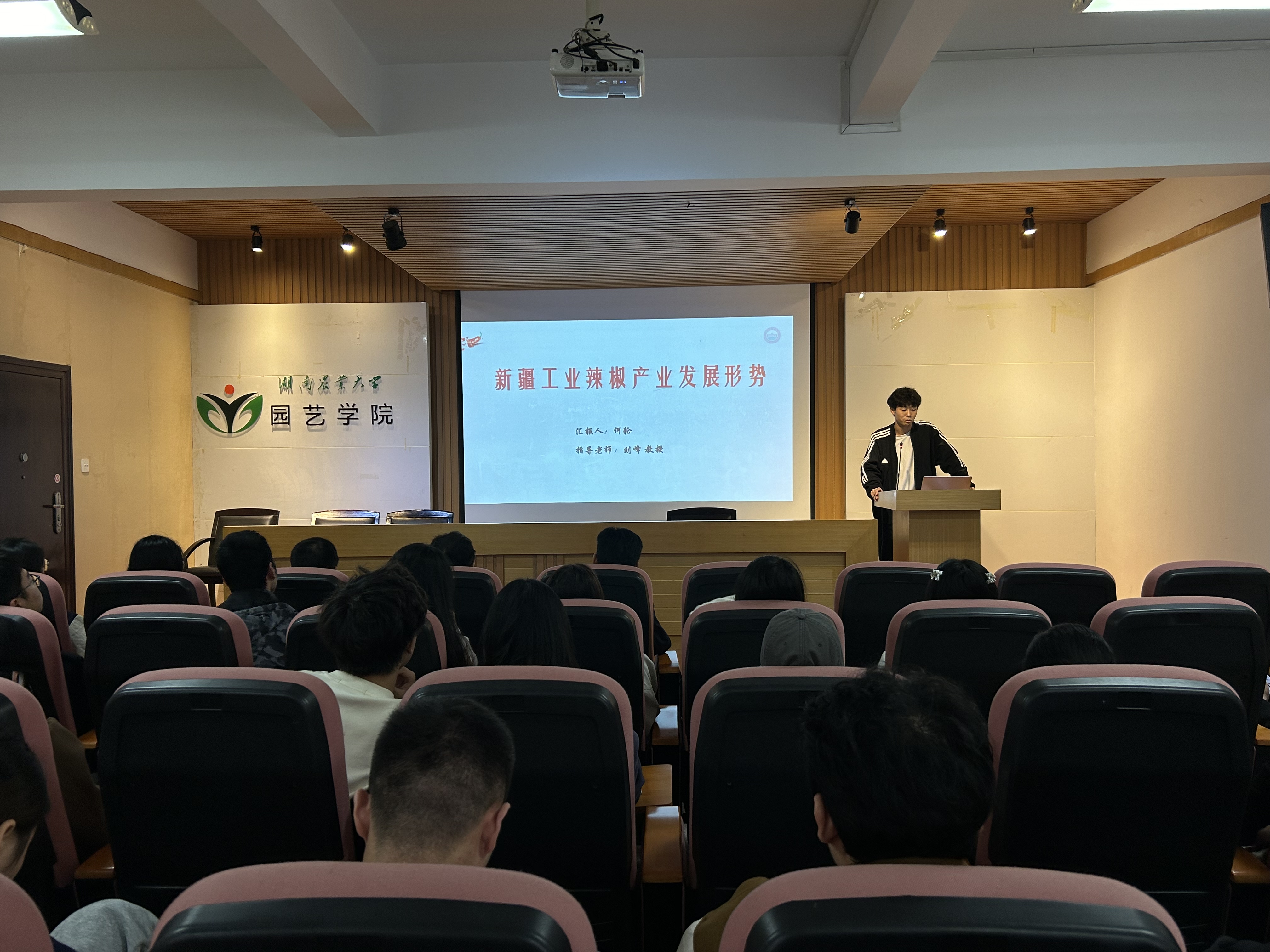 何轮以《新疆工业辣椒产业发展形势》为题,分享了自己的学术与实践经历。从本科起何轮就对于辣椒品种选育产生了极大的兴趣,在指导老师的指点下,他多次前往新疆、海南的辣椒基地开展调研,了解产业发展现状。我国工业辣椒长期依赖印度进口,如何替代印度进口工业辣椒产品,实现工业辣椒国产化,成了他们团队近两年来的重要课题。在邹学校院士指导下,团队攻坚克难,联合湘研种业成功选育了湘涮辣三号等工业辣椒品种。在此基础上,何轮对新疆工业辣椒产业的背景、市场、种植基地、加工企业等多方面进行分析,提出了一系列促进新疆工业辣椒产业发展的相应对策。近年来,在邹学校院士和刘峰教授指导下,他申请国家发明专利2项、申请商标1项、荣获湖南省最美大学生称号。2024年,入围了第十八届中国大学生年度人物、荣获中国国际大学生创新大赛银奖。