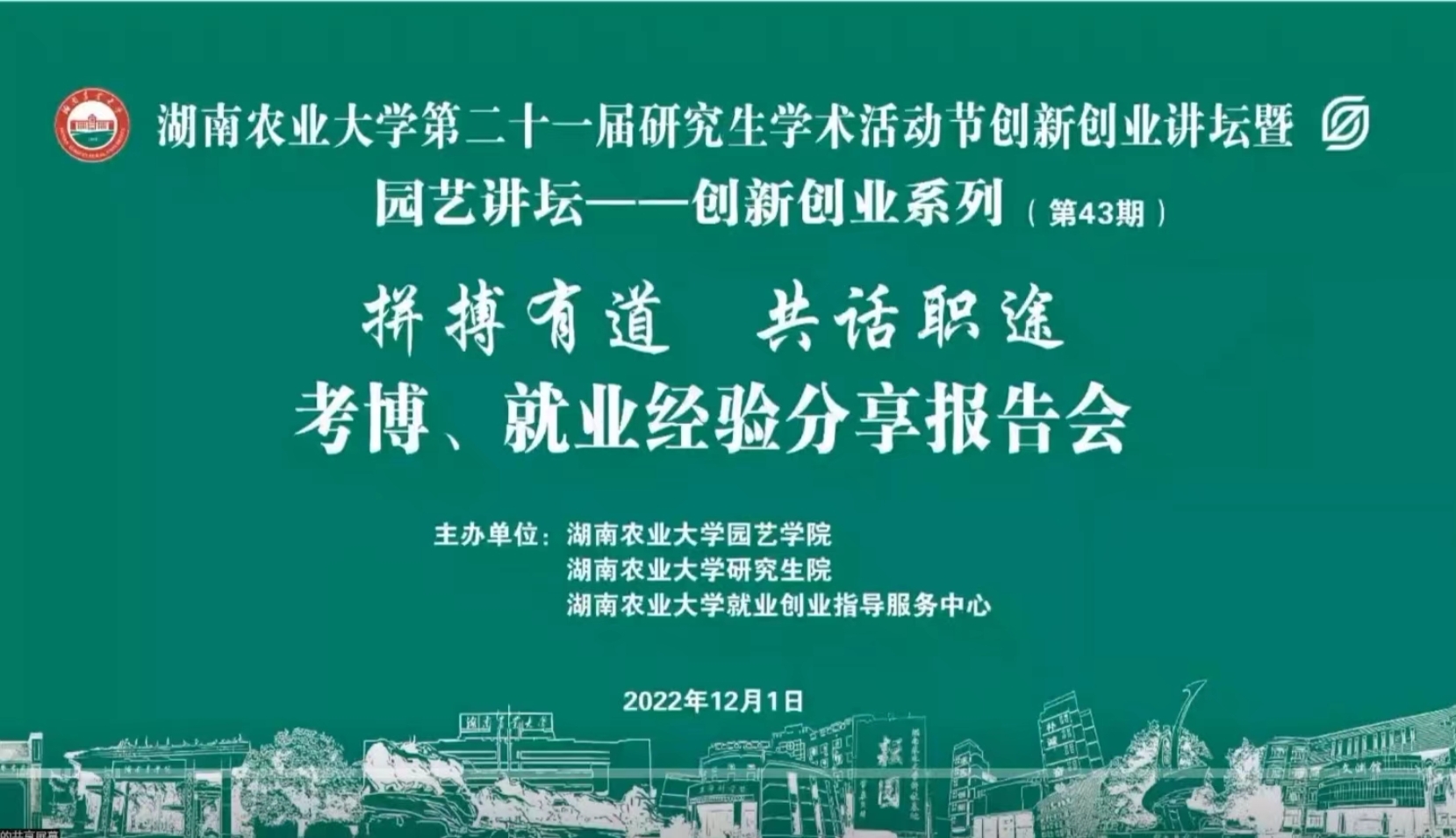 通过人才引进考入梧州市农业科学院杨益欢和湖南省农科院孙梦姗的分享生动而接地气。杨益欢着重分享了简历的制作技巧,简历要简洁、凸显优势和真实可信,要根据目标行业不断调整修改,不能一份简历通用。孙梦姗以自己的实践经验,概括总结出在求职时如何准确精炼的突出自己的优势,为毕业研究生求职时制作简历提供了参考。湖南省2022届选调生谭鑫、新疆公务员王恒乐分别从备考策略与方法、各地选调分析及建议等模块分享了经验。他们建议师弟师妹们在备考过程中尽早完成毕业论文、广泛参加行政岗位实习、扎实进行模拟训练、时刻关注时事新闻。他们强调在就业择业中要注重协调各个目标的优先性,合理调控选调生备考和其他事务的关系。